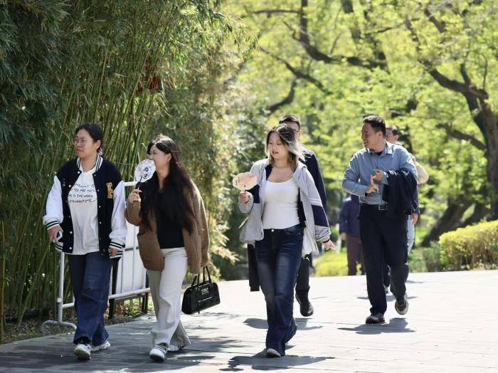 4月10日,玉渊潭公园,外国游人穿着背心游园。